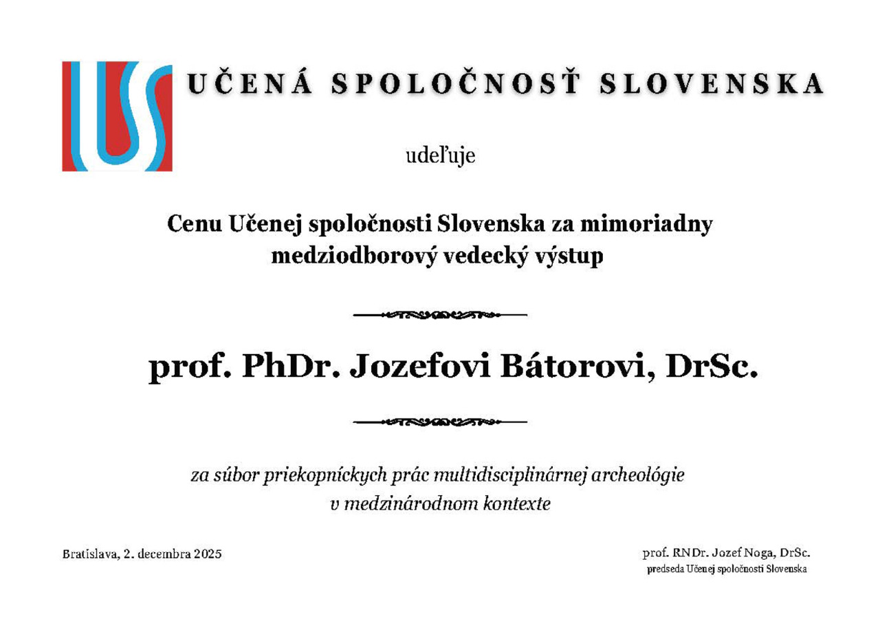 Dňa 2. decembra 2025 sa konalo v Bratislave Valné zhromaždenie Učenej spoločnosti Slovenska (UčSS). Rada UčSS pri tejto príležitosti udelila prof. PhDr. JOZEFOVI BÁTOROVI, DrSc., Cenu Učenej spoločnosti Slovenska za rok 2025 „za mimoriadny medziodborový vedecký výstup za súbor priekopníckych prác multidisciplinárnej archeológie v medzinárodnom kontexte“.