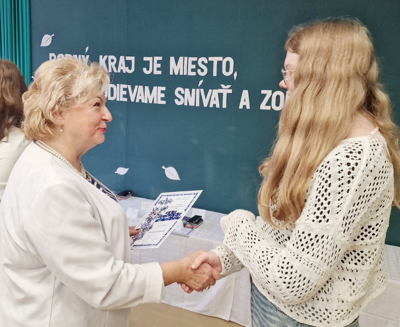 Na snímke vpravo EVA SISKOVÁ, predsedníčka SSS (vľavo) blahoželá KAMILE CIBULOVEJ zo Základnej školy v Tlmačoch, ktorá získala hlavnú cenu v 15. ročníku súťaže Cena Andreja chudobu za poviedku Kanárik