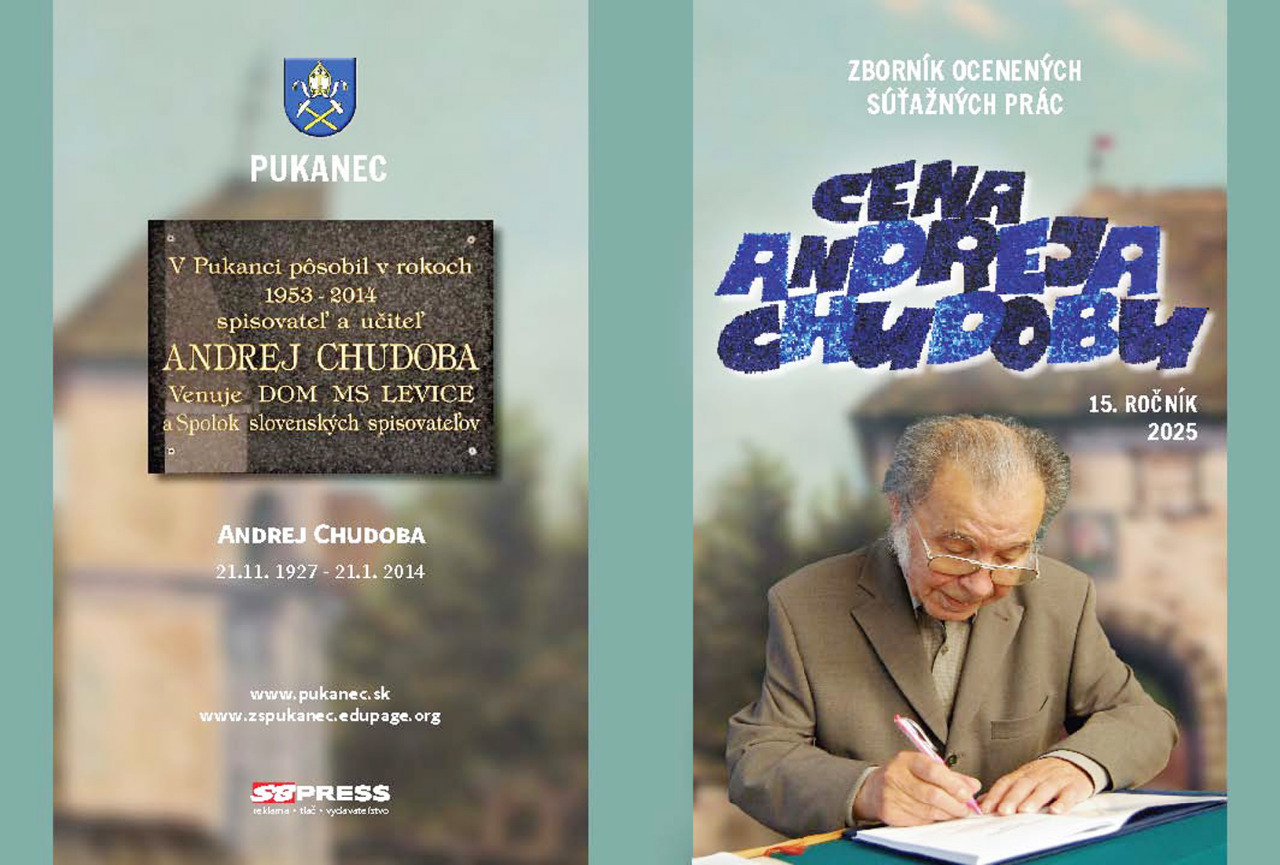 Predná a zadná strana zborníka súťaže. Vpravo Andrej Chudoba, vľavo pamätná tabuľa Andreja Chudobu, ktorú dali osadiť v Pukanci Dom Matice slovenskej Levice a Spolok slovenských spisovateľov.